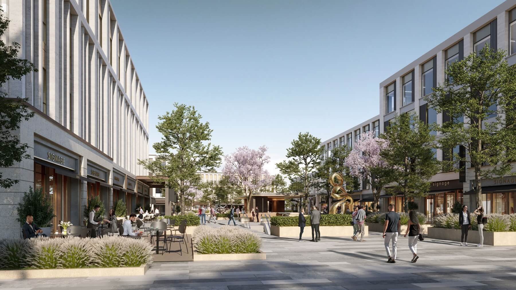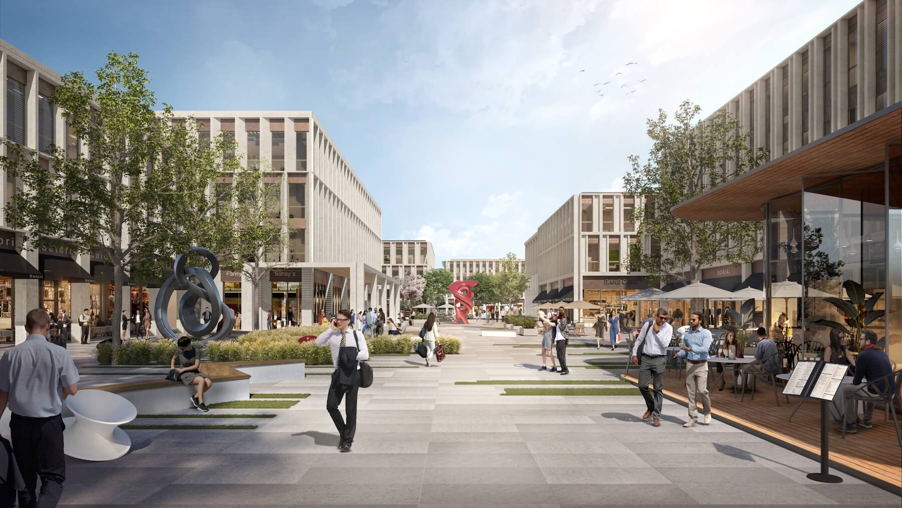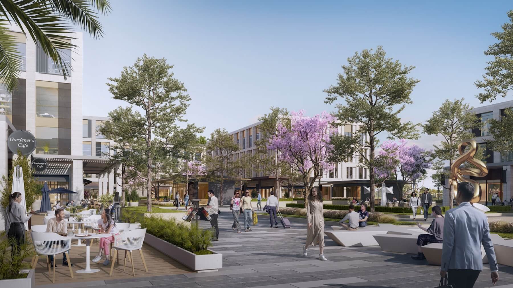A contemporary mixed-use destination blending office spaces and retail with a relaxed, easy-going atmosphere for work, shopping, and dining.